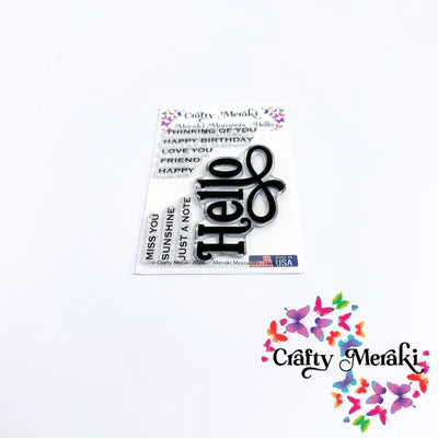 Sending a special hello? Express it with Crafty Meraki's Meraki Moments Hello Stamp Set. This 3x4 set includes the main sentiment "hello" and smaller supportive sentiments for that extra touch of sweetness on all your handmade cards. Perfect for scrapbooking and cardmaking.