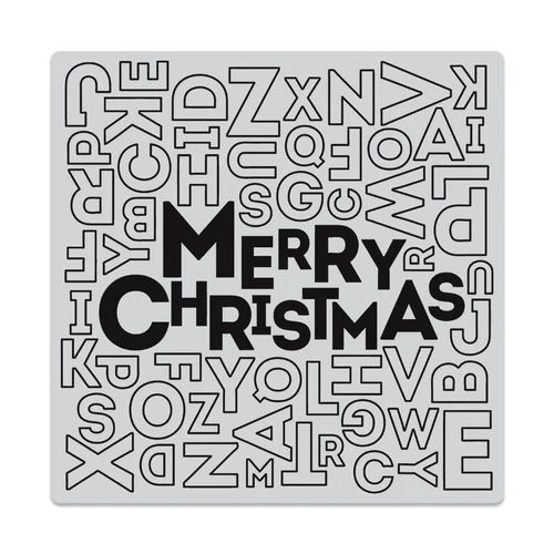 A bold graphic background of jumbled letters, resolving to a message of "Merry Christmas".