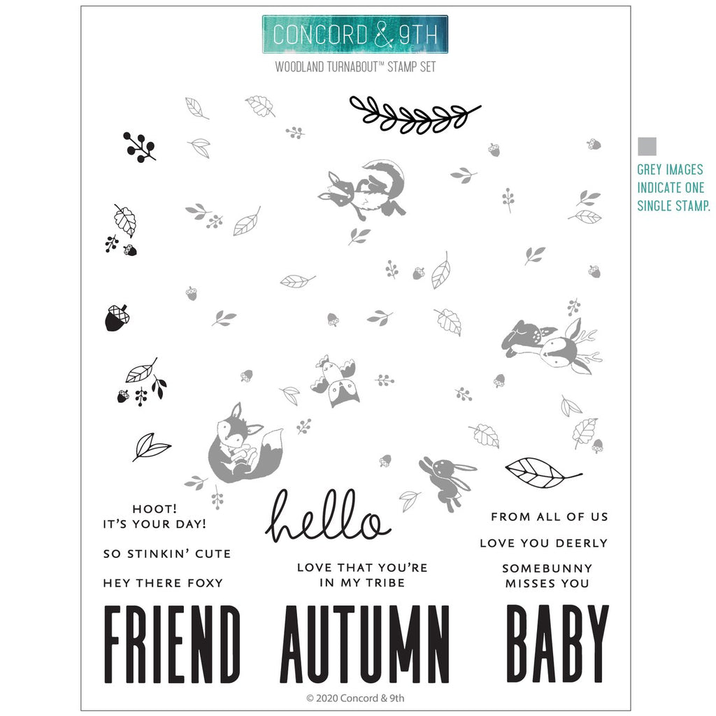 Bunnies, foxes, and skunks! Oh my! Oh, and a dear little deer! And a wise little owl. And some fun falling leaves. This charming Woodland Turnabout™ Stamp Set just shouts autumn in the most adorable voice ever. Don’t forget about the punny little sentiments: “Somebunny misses you.” “So stinkin’ cute.” “Hey there foxy.” We can’t even. We’re going to die from cuteness. Speaking of die, it even has coordinating Woodland Dies. There is nothing this stamp set is missing—except you! 6" x 8". 10 stamps.