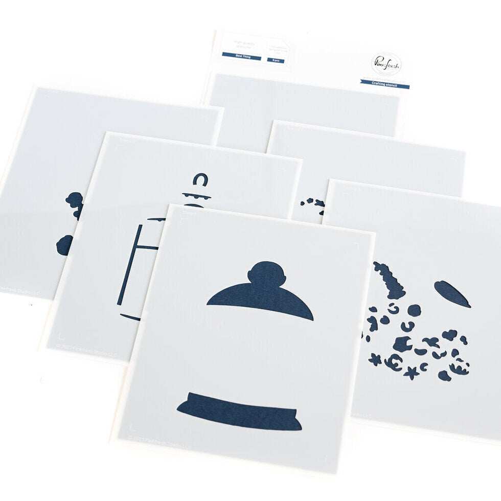 There is a separate stencil for each layer, with guidelines on each stencil for perfect alignment when using alone. Two of the stencils ink blend the birdcage, and the other four stencils ink blend the florals & bird. When using the stencils with the stamped image you will forego the alignment guides, and instead align each layer to the stamped images. Use them without the stamped image for a softer look. Use the coordinating stamp to add more detail to the image by stamping with detail black or heat embossing in your favorite powder for added shine.