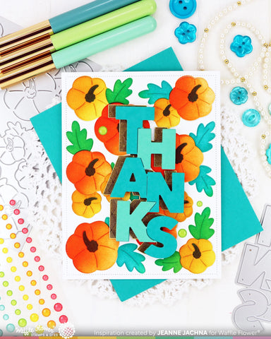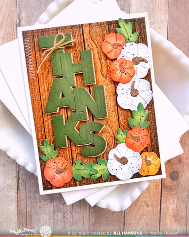 This die features the word “Thanks” arranged vertically with the letters slightly overlapping, so you can cut it out as one solid piece. Try framing two opposite corners with your favorite flower images, then place this word die front and center on a card.