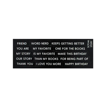 Add the perfect Story sentiment to your cards with this subsentiments diecut sheet. This sheet includes 15 sentiment strips in 1/4" increment in width.