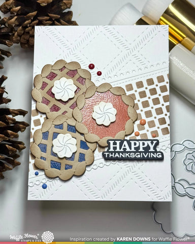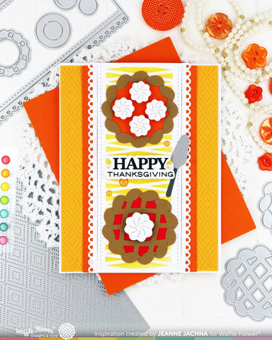 Stack the crimped crust with the whipped topping for a classic pie look, or try layering three shades of cardstock to highlight the decorative vent. Use the lattice piece for a woven top, or mix and match the pieces for your own custom creation. Add doodled details for extra charm—there are lots of ways to sweeten up your table setting on a card!