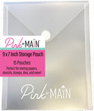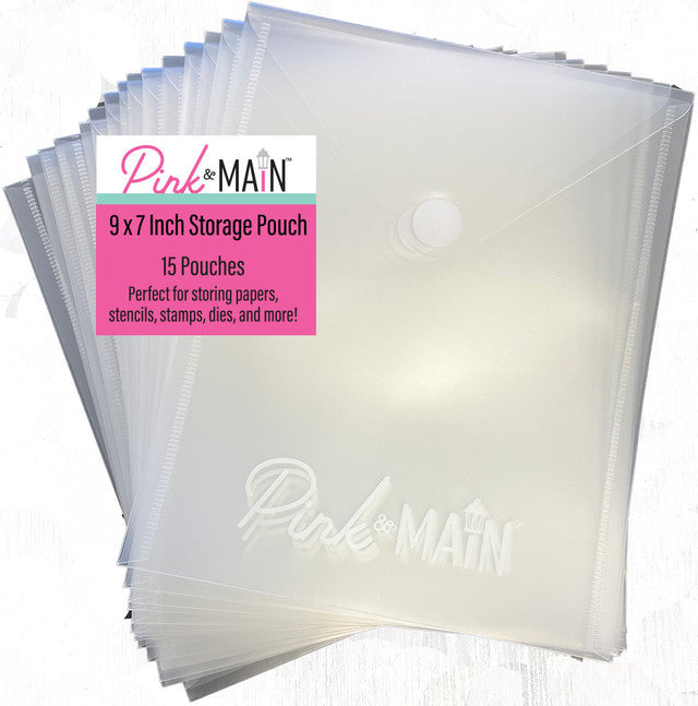 These storage pounches are made of nice, thick plastic. They measure 9x7 inches, and have a closure flap with a snap at the top. These are great for storing paper, stencils, stamps, dies, and more.
