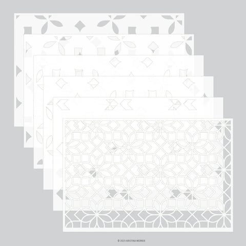 Sized perfectly for A2 cards (4.25” x 5.5”), A7 cards (5” x 7”) and even larger projects, the Cara Medallion Stencil Pack includes five stencils to create a colorful pattern, and a sixth stencil with the full design. Six 6" x 9" stencils.