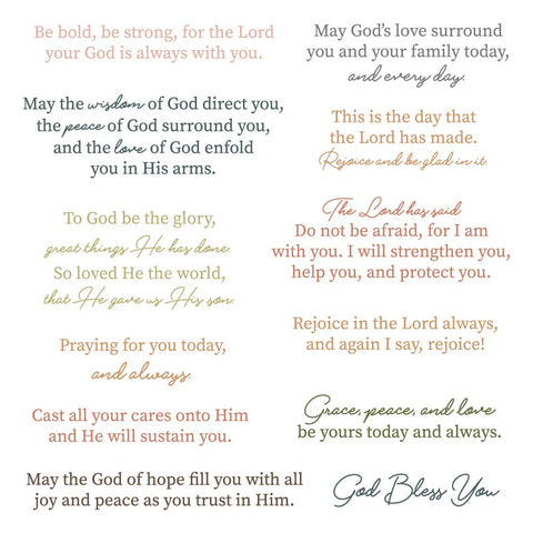 Express heartfelt messages with this beautiful 12-piece 6" x 6" clear photopolymer stamp set celebrating God's love. Designed and crafted with passion right here in the USA, these premium stamps deliver crisp, clean impressions every time. The generous size gives you plenty of room to create meaningful cards, scrapbook pages, and faith-based projects that touch the heart. Perfect for layering, combining, and bringing your most inspiring designs to life. Stamp with purpose!