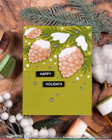 This stamp set adds realistic detail to stenciled pinecones. Both the stencil and stamp are numbered to make lining up the pieces easy. You can stamp the details directly over the stenciled images or stamp first and add color with the stencil. The detail images also coordinate with the shape die for cutting out layered pinecones.